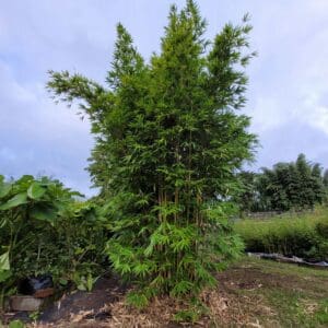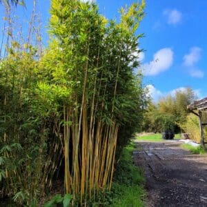This bamboo variety is highly adaptable, thriving equally well in both sun and shade. Its cold hardiness down to -4°C makes it suitable for a range of climates, ensuring that it can withstand cooler temperatures without compromising its lush appearance. Doli Bamboo’s upright growth habit and dense foliage make it particularly effective for pleaching, a technique where the lower leaves are removed to create a structured, hedge-like appearance.